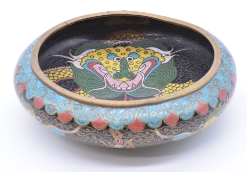 Chinese cloisonné enamel dish depicting a dragon chasing a flaming pearl, diameter 14cm