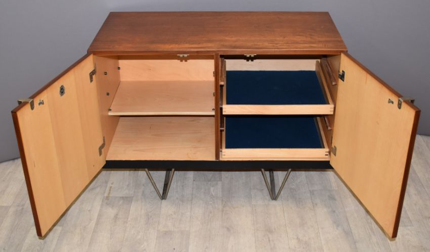 Retro / mid century modern Stag S range twin door sideboard with interior drawers, raised on pin legs, designed by John and Sylvia Reid, with Maple label inside door W91 x D46 x H70cm