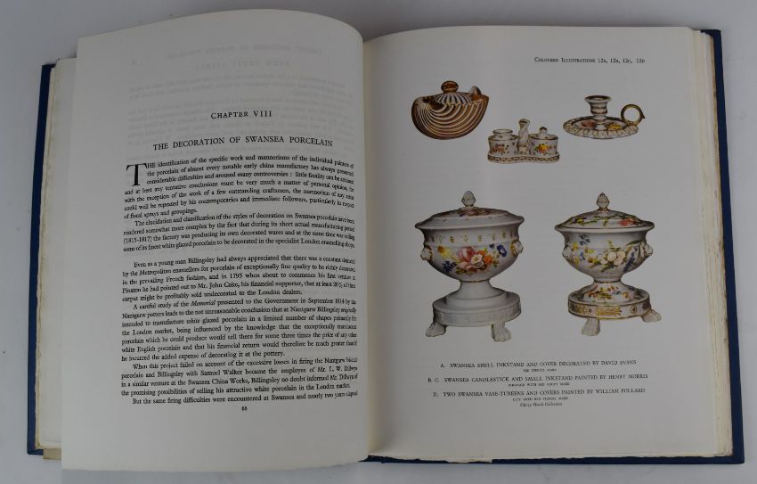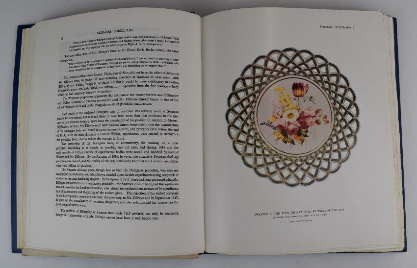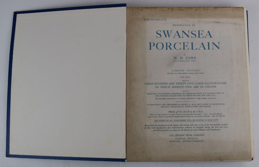 Swansea Porcelain by W.D. John with over 450 specimens illustrated of which 81 are in colour, published The Ceramic Book Company 1958 first edition, bound in cloth with gilt title & coat of arms and publisher's original illustrated prospectus