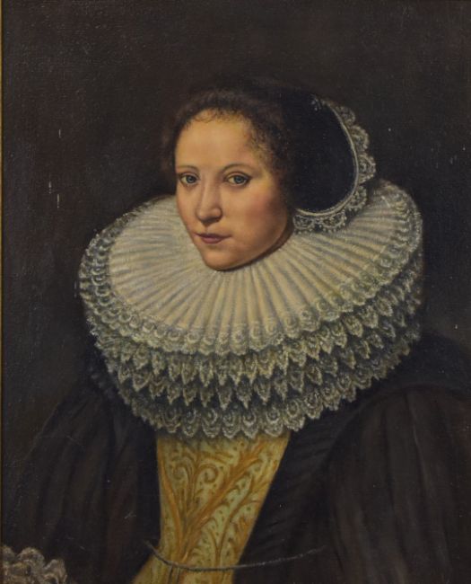 Oil on board lady in period dress with large ornate ruff, 47 x 37cm, in gilt frame