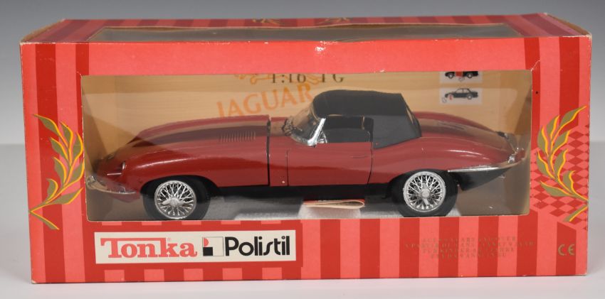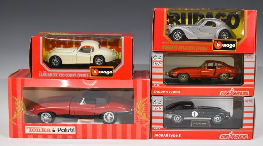 Five 1:24 and 1:16 scale diecast model cars comprising Tonka Polistil Jaguar Mk/2 TG, Burago Bugatti Atlantic 1936 1503, Jaguar XK 120 coupe 1948 1508 and two Majorette Club Jaguar E Type 4102, all in original display boxes.