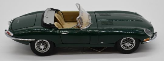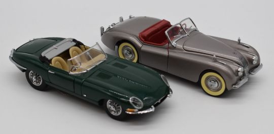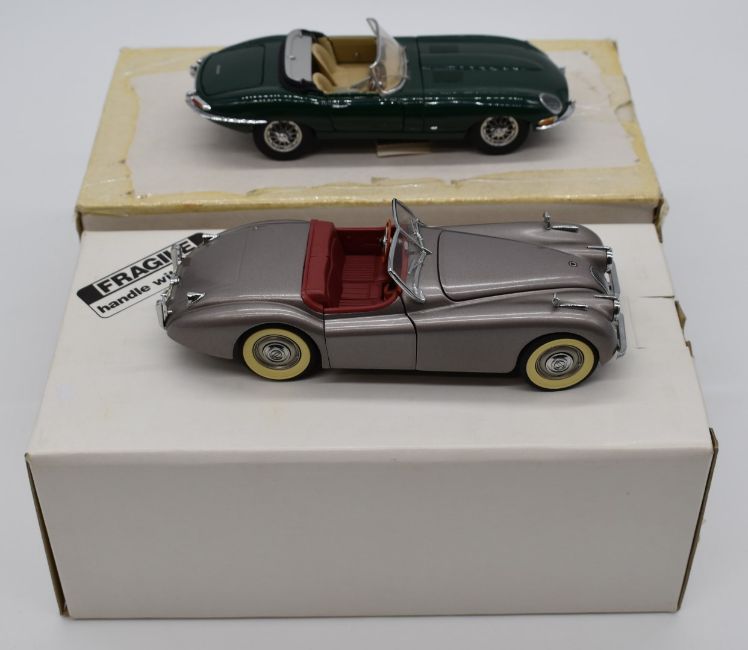Two Franklin Mint diecast model Jaguar cars The 1949 XK120 and 1961 E-Type, both in original boxes.