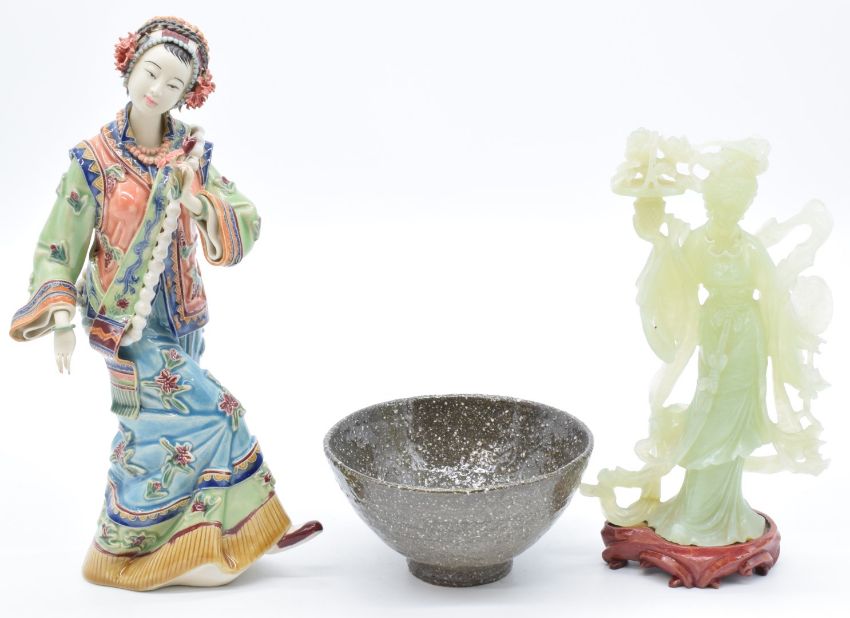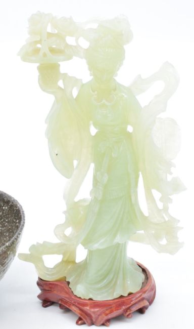 Chinese carved jade/jadeite or similar hardstone figurine, figure of a girl carrying a flower with script inside skirt and Chinese Yeongam pottery bowl, tallest 27cm