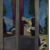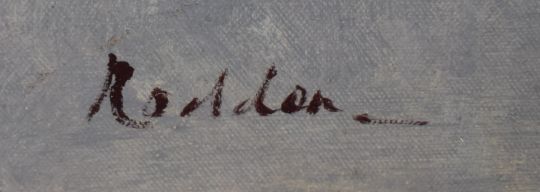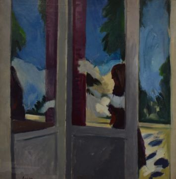 Guy Roddon (1919-2006) oil on canvas continental view from behind large folding doors, signed lower left, 75 x 72cm, in painted frame