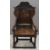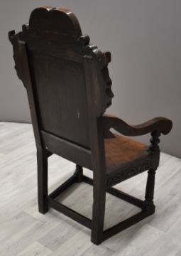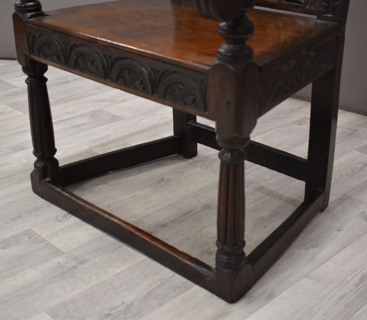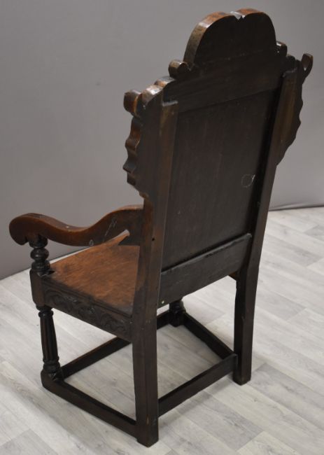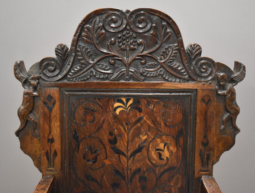 17thC English jointed inlaid oak wainscot chair with shaped scrolling pediment with inlaid foliate decoration flanked by winged figures, the single piece central back inlaid with flowers, the scrolling arms line engraved with deeper carved hand rests, the single piece plank seat with carved apron having a repeating semicircular design, the front legs with turned and fluted decoration, the back legs of square form united by four simple stretchers, W59 x D54 x H41cm (of seat), total height 119cm.Provenance: Originally from The Manor, Ashby St Ledgers
