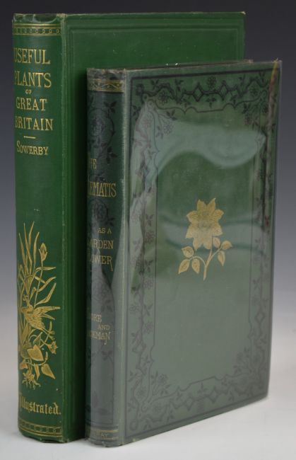 The Clematis As A Garden Flower: being Descriptions of the Hardy Species and Varieties of Clematis or Virgin’s Bower, with select & classified lists, directions for cultivation & suggestions as to the purposes for which they are adapted in modern gardening by Thomas Moore & George Jackman, 1872 first edition with 17 plates (including 2 folding hand-coloured plates) bound in gilt cloth, The Useful Garden Plants of Great Britain by C. Pierpoint Johnson Illustrated by John E. Sowerby (c.1865) with hand-coloured plates, bound in cloth with gilt illustrated spine (2)