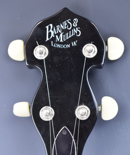 Barnes and Mullins of London W. five string banjo, with beginner's book and spare strings, in fitted carry case