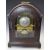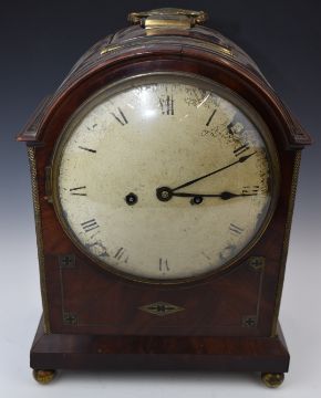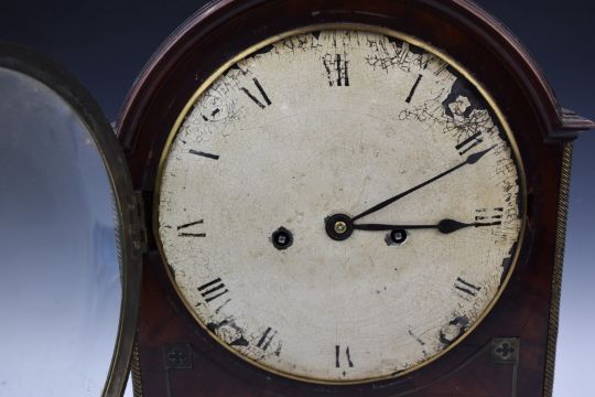 19thC arch cased mahogany mantel clock with brass inlay, the painted Roman dial on double fusee movement striking on a bell visible through rear glass door, raised on brass ball feet, H38cm