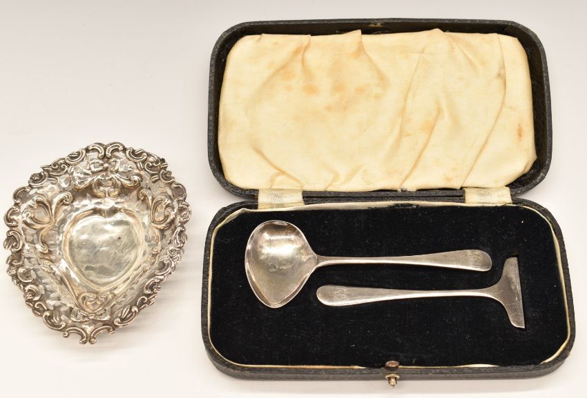 Edward VII hallmarked silver heart shaped bon bon dish, Birmingham 1903, length 10.5cm, together with a cased hallmarked silver spoon and pusher set, weight 45g