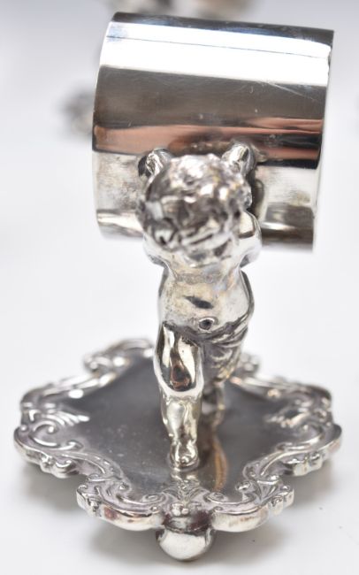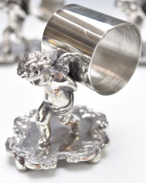Set of eight silver plated napkin rings formed as cherubs carrying the rings, height 9cm