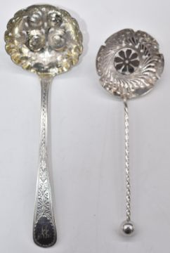 Two hallmarked silver sifter ladles, one Irish, Dublin 1833, maker George Bayly, the other Chester 1900, maker's mark AF, length of longer 16cm, weight of both 51g