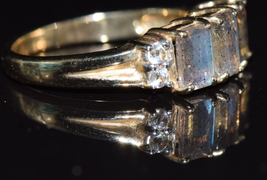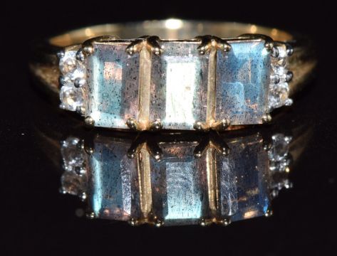 A 9k gold ring set with labradorite and white topaz, 3.8g, size M