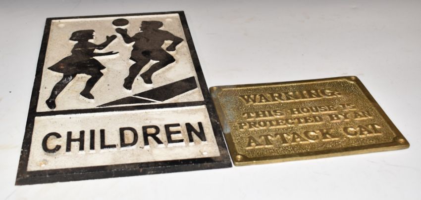 Children cast iron road sign, 30.5 x 18.5cm, together with a novelty brass attack cat sign 12 x 16.5cm