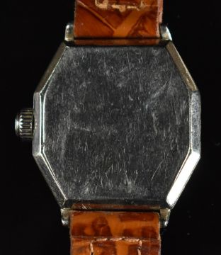 Gruen Art Deco gentleman's wristwatch with subsidiary seconds dial, skeleton hands, Arabic numerals, silver dial, octagonal case and signed 15 jewel movement, on brown leather strap, case diameter 30mm, serial number 8628740.