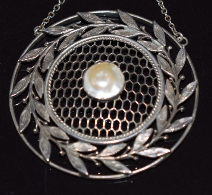 Arts & Crafts silver necklace with lattice and foliate decoration set with two mother of pearl cabochons, 3.7cm diameter, 38cm long