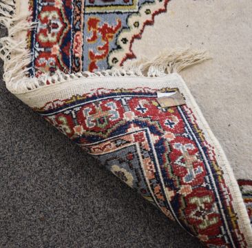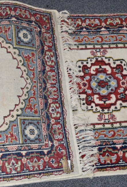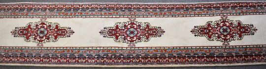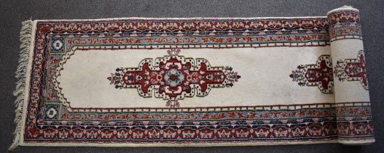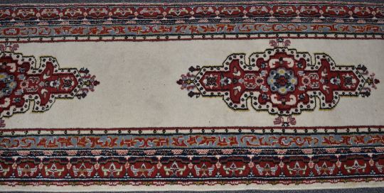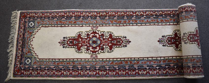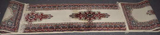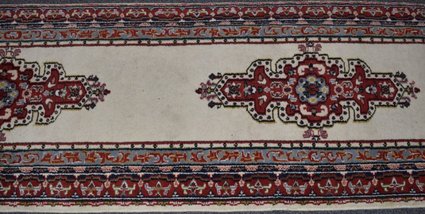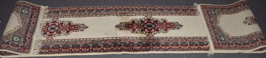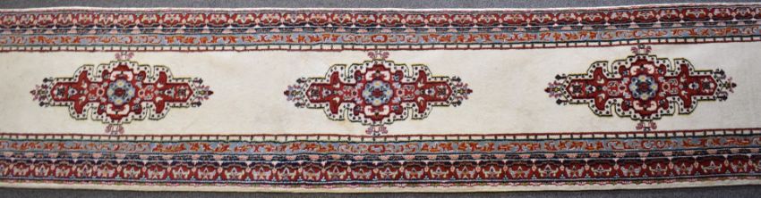 Runner rug with cream ground and blue and red border, 410 x 80cm