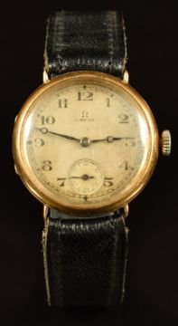 Omega 9ct gold gentleman's wristwatch with inset subsidiary seconds dial, blued Breguet hands, silver dial and signed 15 jewel movement, on black leather strap, case diameter 31mm, serial number 408083.