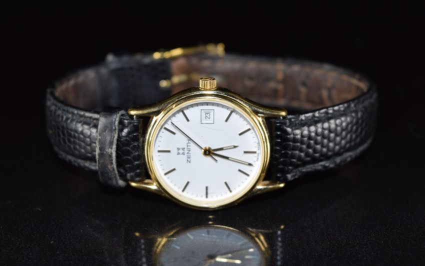 Zenith ladies wristwatch ref. 27-2220.106 with date aperture, luminous hands, gold baton hour markers, white dial, gold plated case and quartz movement, on black leather strap, case diameter 24mm, in original box with outer card box and international guarantee.