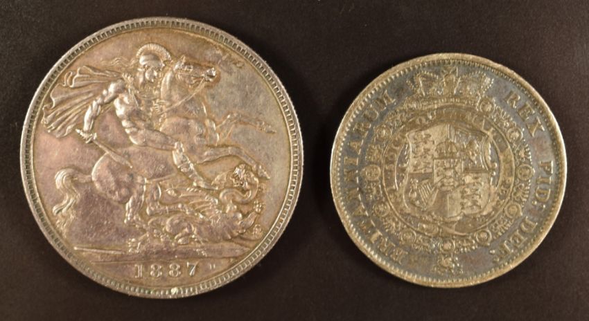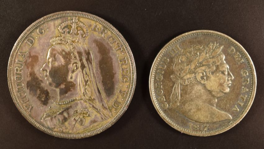 George III 1817 bull head half crown and an 1887 Victorian crown
