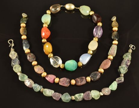 Three beaded necklaces comprising one fluorite with silver spacers and silver clasp, Prevost ruby and tourmaline with gilt spacers and silver clasp and Prevost amethyst, agate, and garnet with gilt spacers and silver clasp