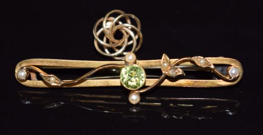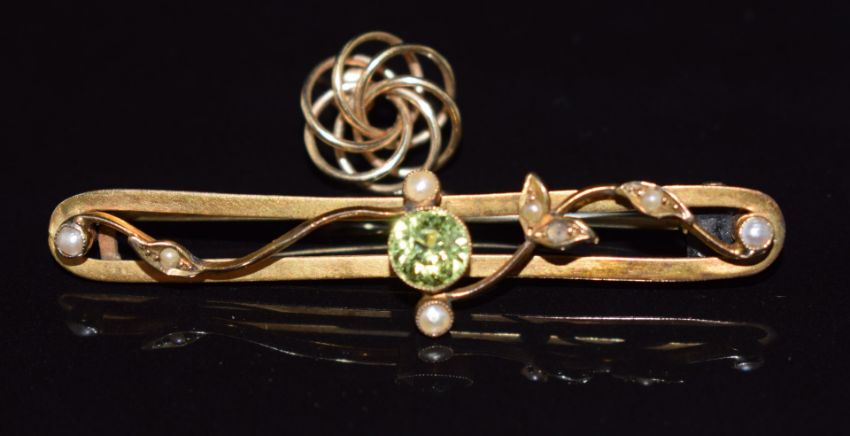 Edwardian 9ct gold brooch set with a peridot and seed pearls and a gold earring, 2.8g