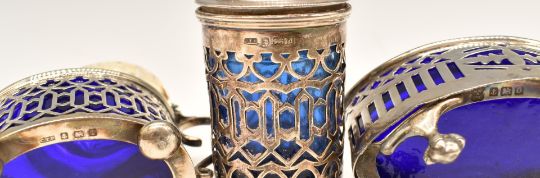 Hallmarked silver cruet items comprising pepper, open salt raised on ball and claw feet and a mustard, all with blue glass liners, length of longest 8.5cm, together with a hallmarked silver spoon to suit and a silver plated spoon, weight without liners and plated spoon 151g