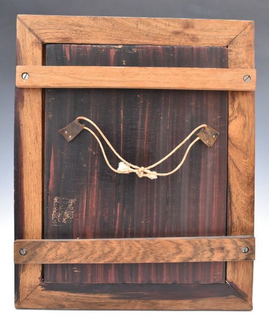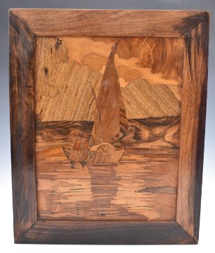 Arts & Crafts marquetry panel depicting a sailing boat, after William Chase for The Rowley Gallery, 34 x 28cm overall
