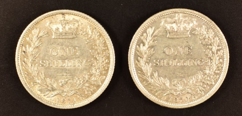 Queen Victoria 1870 shilling die 15, together with an 1871 example die 13, both AEF