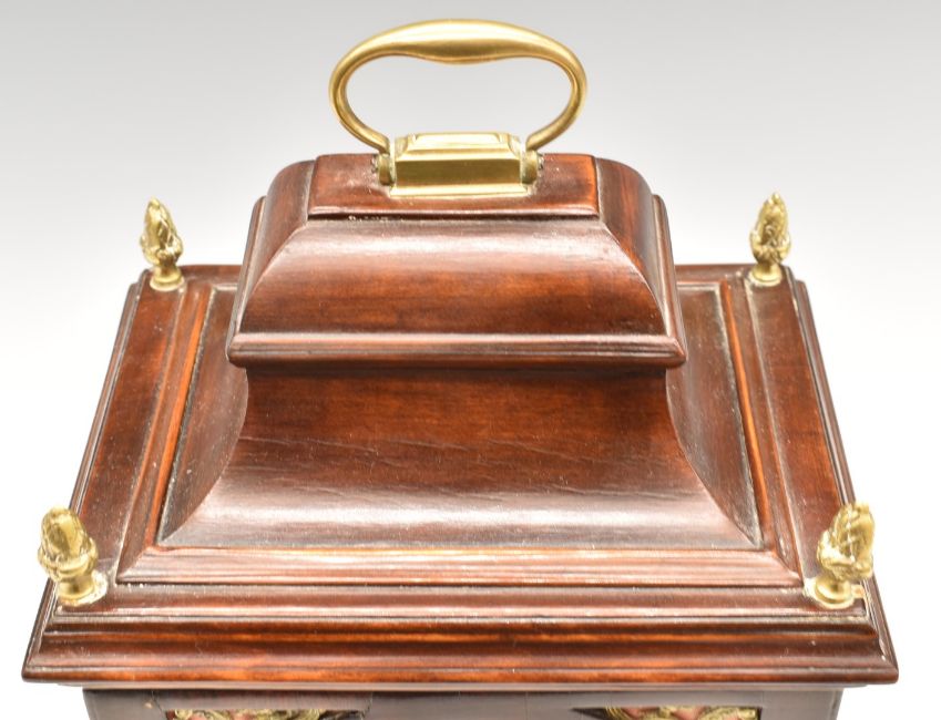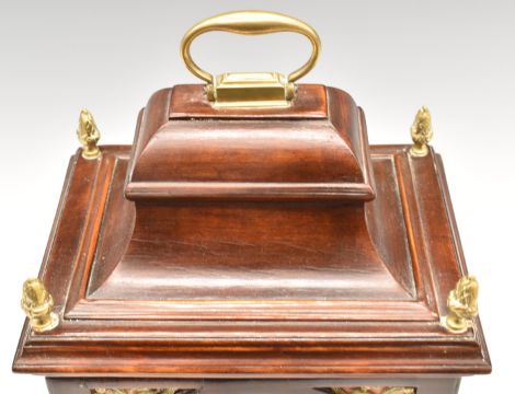 Late 18thC mahogany bracket clock with verge escapement, moon phase and alarm functions, the case having pierced brass side panels and acorn finials, handle and bracket feet, H38cm
