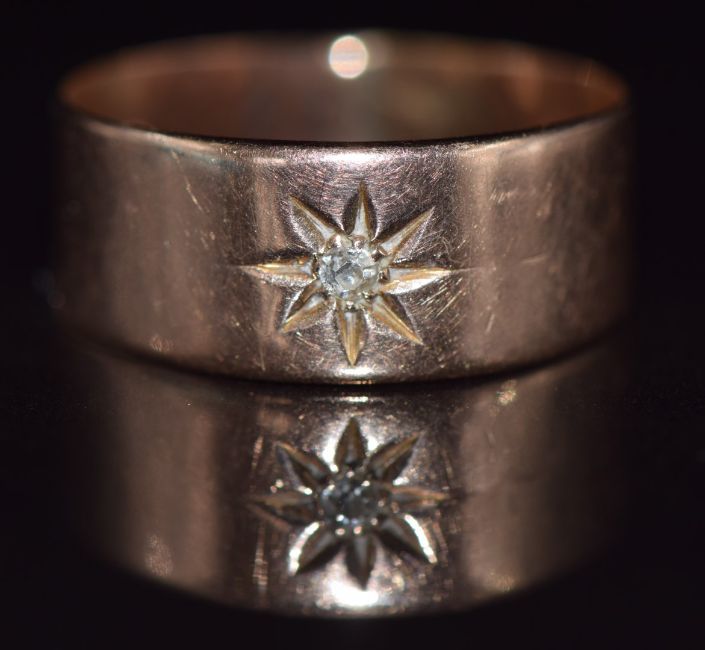 A 9ct rose gold ring set with a diamond in a star setting, Birmingham 1916, 3.1g, size P