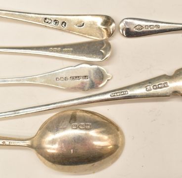 Various hallmarked silver cutlery to include set of four Georgian teaspoons, two further sets of four spoons, pickle fork and butter knives together with a Poul Frigast Danish silver caddy spoon and two hallmarked silver napkin rings, weight 530g