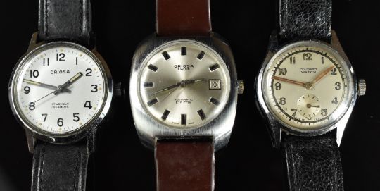 Three gentleman's stainless steel wristwatches comprising Oriosa automatic, Oriosa manual winding and Courbet, all on leather straps, largest case diameter 36mm.