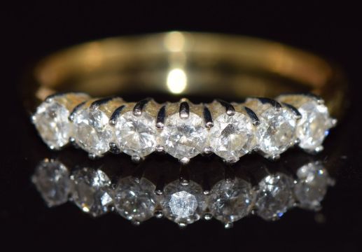 An 18ct gold ring set with seven diamonds, each approximately 0.1ct, 3.g, size S