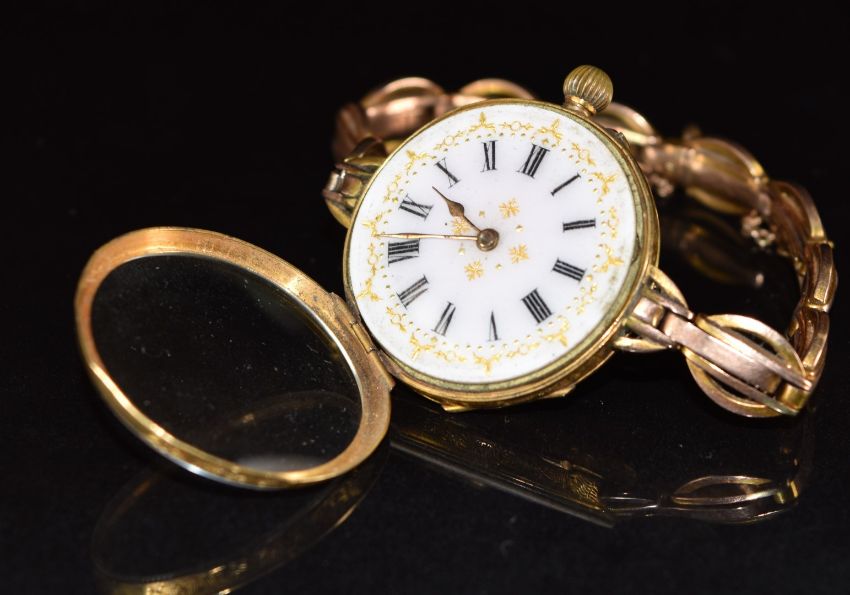Unnamed 18ct gold ladies wristwatch with gold hands, black Roman numerals, gilt decorated white enamel dial and unsigned movement, on 9ct gold bracelet, case diameter 30mm, serial number 34330, 31.7g.