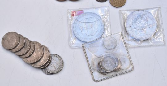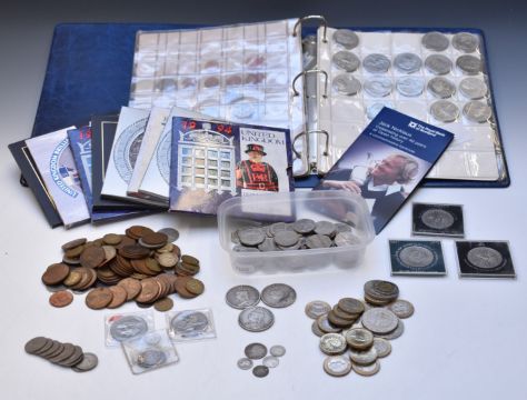 An amateur coin collection in the whole including three Victorian crowns, brilliant uncirculated UK coin packs, collectable modern coinage including 50p coins, folder of crowns / £5 coins etc