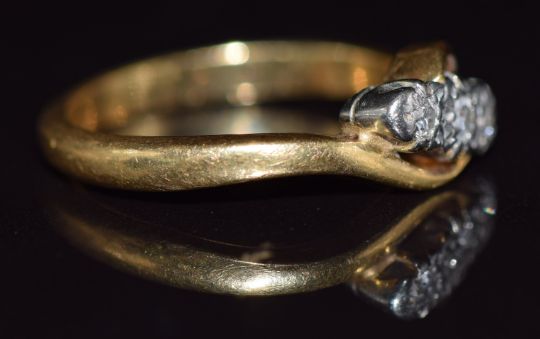 An 18ct gold ring set with three diamonds in a platinum twist setting, 4g, size L