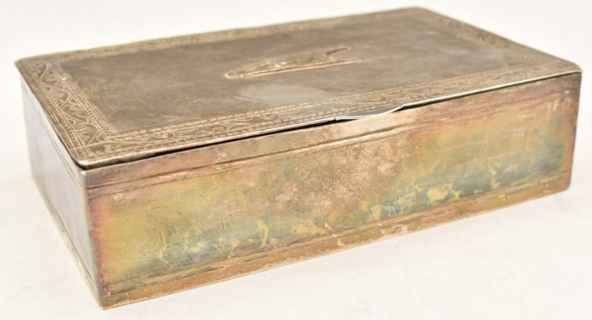 African hallmarked silver cigarette box, with Omdurman (Sudan) 1926 to base and import marks for London 1938, maker mark R G Hennell & Sons, length 18cm