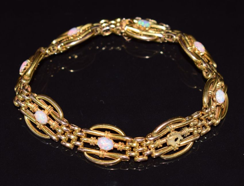 Edwardian 9ct gold bracelet set with oval cabochons, 18cm long, 15.5g