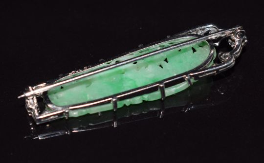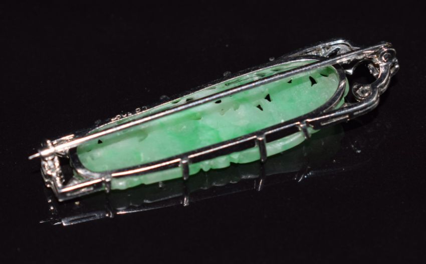 Art Deco 18ct white gold and platinum brooch set with a carved jadeite plaque and rose cut diamonds, length 5cm, in original William Lister & Sons Ltd, Newcastle Upon Tyne box
