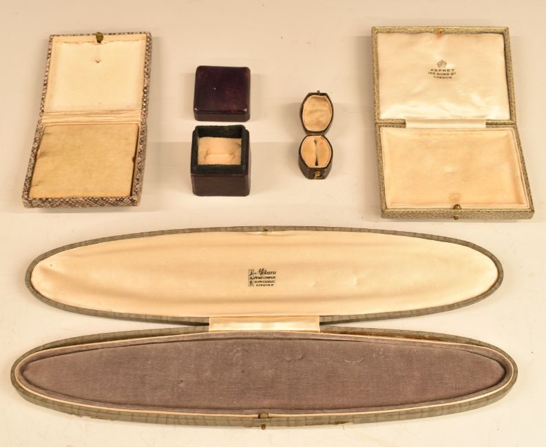 Five vintage jewellery boxes including Mikara Pearl Company, Piccadilly, Asprey, etc