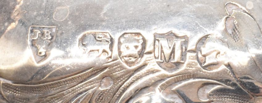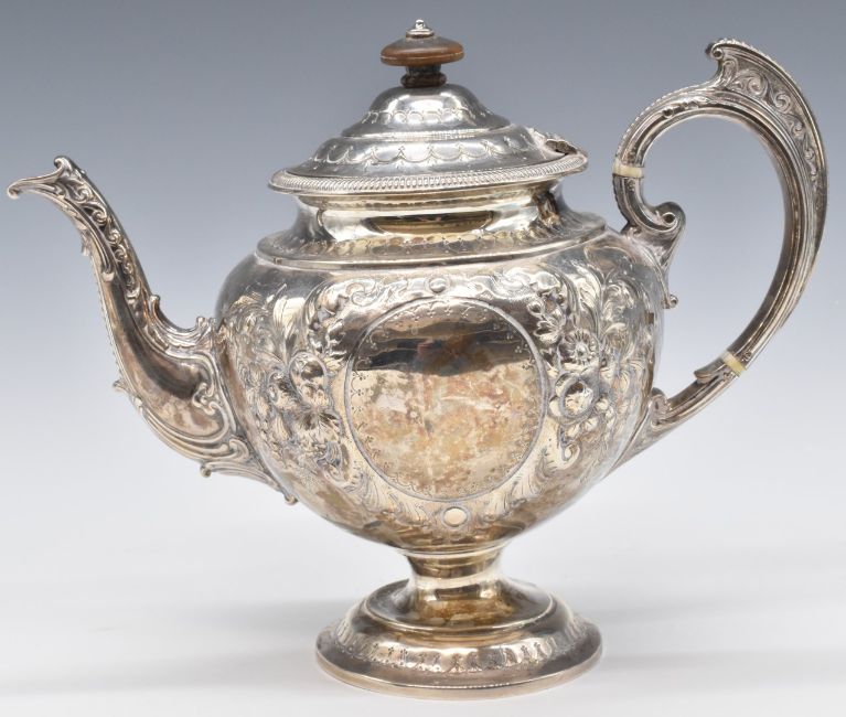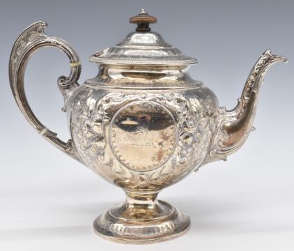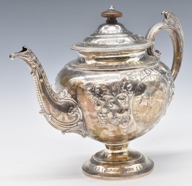 Victorian hallmarked silver pedestal teapot with embossed decoration, London 1887, maker's mark indistinct, likely JB B, height 20.5cm, weight 655g all in