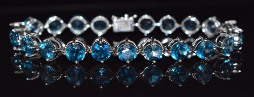 A 9k white gold bracelet set with London blue topaz total weight approximately 30cts, 18cm long, 19.1g