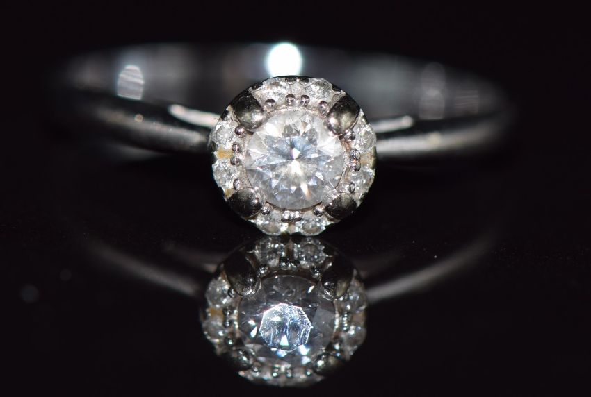 An 18ct white gold ring set with a diamond of approximately 0.2ct surrounded by further diamonds, 2g, size K