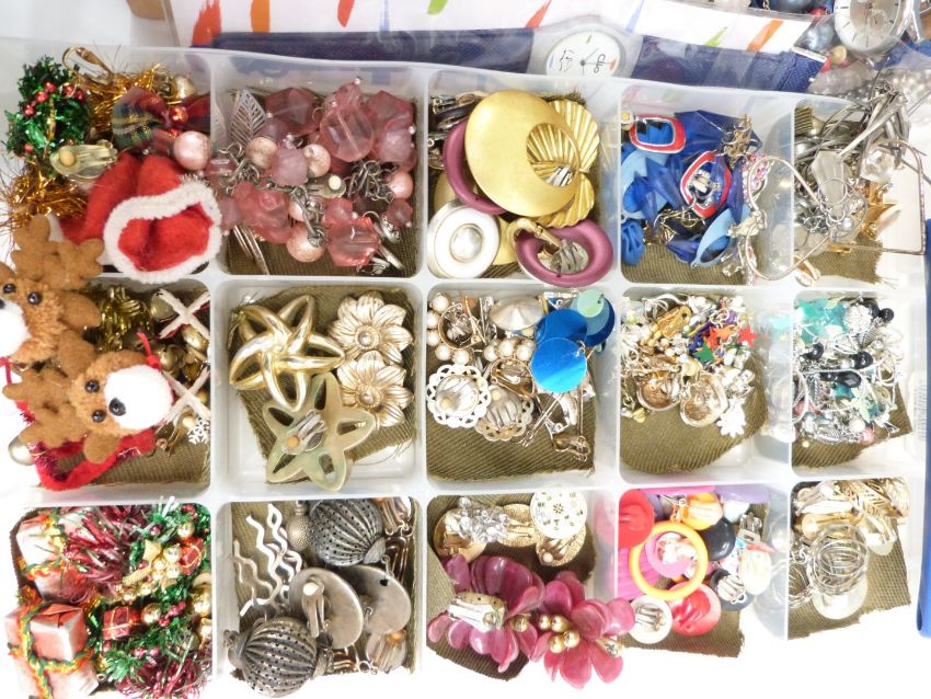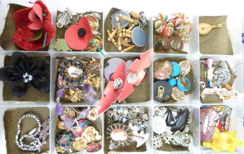 A collection of costume jewellery including vintage earrings, micro mosaic brooch, silver earrings, agate necklaces, etc