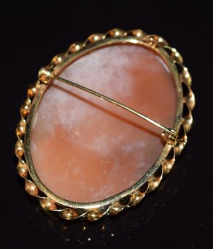 A 9ct gold brooch set with a cameo depicting a young woman, 3.5 x 5cm