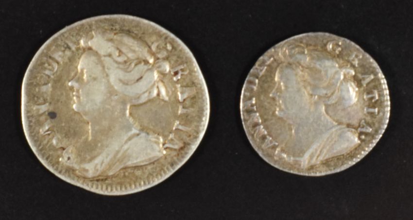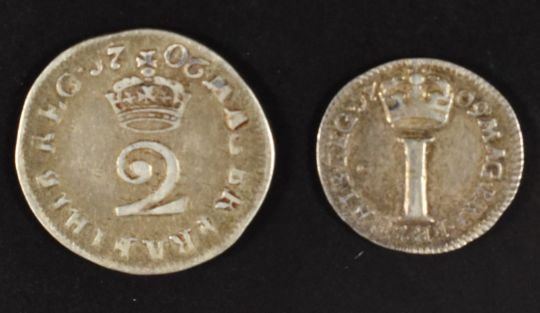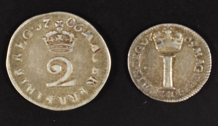 Queen Anne maundy 2d 1706 1st bust, Seaby 3597 (GF) together with a maundy 1d 1709, Seaby 3598 (NVF)