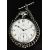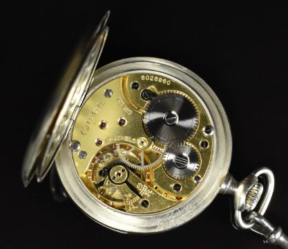 Omega keyless winding open faced pocket watch with subsidiary seconds dial, gold hands, black Arabic numerals, white dial and signed 15 jewel movement, case diameter 50mm, serial number 8028960, on hallmarked silver graduated chain.