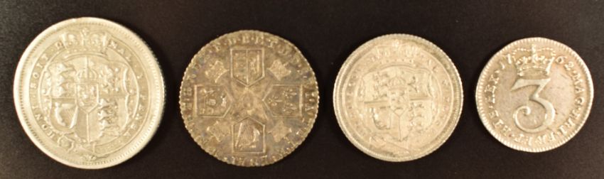 George III 1787 shilling with a 1762 threepence, together with two bull head examples comprising an 1819 shilling and an 1816 sixpence