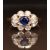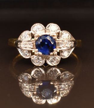 An 18ct gold ring set with a round cut sapphire and diamonds, 4.7g, size Q