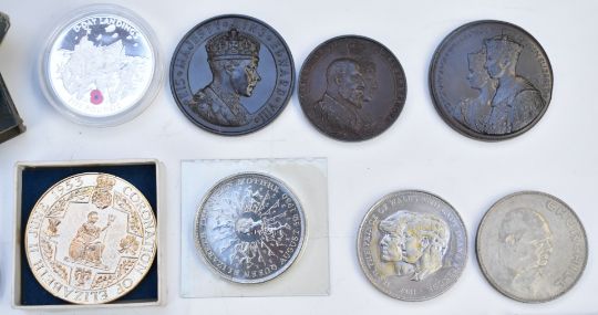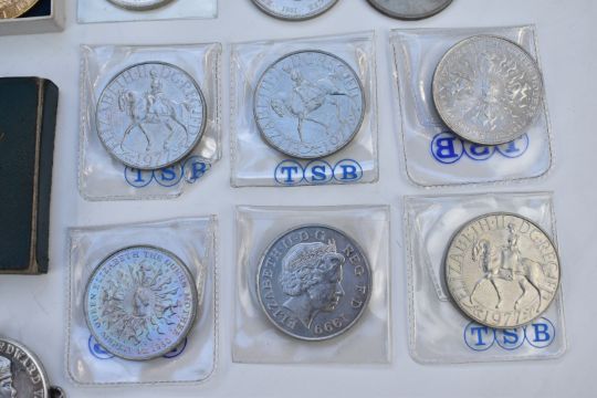 A quantity of modern UK crowns to include Festival of Britain and £5 examples, together with some Royal commemorative medal coins etc, Queen Victoria onwards